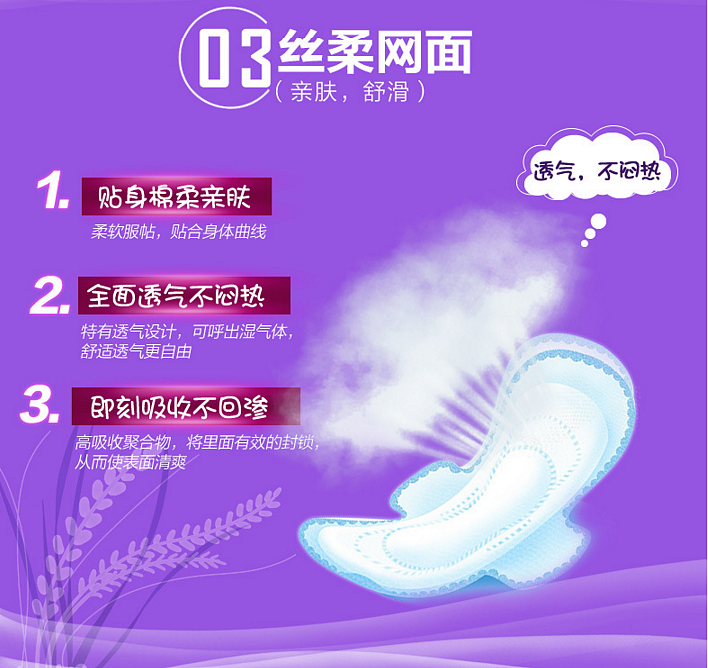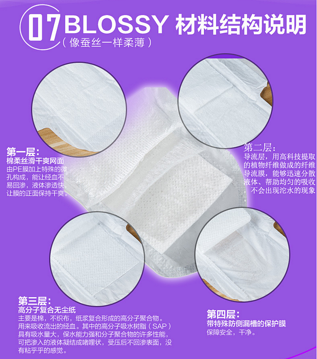 结构:棉质丝滑网面,液体浸透快,四层带特殊防侧漏槽,安全无痕,干净。