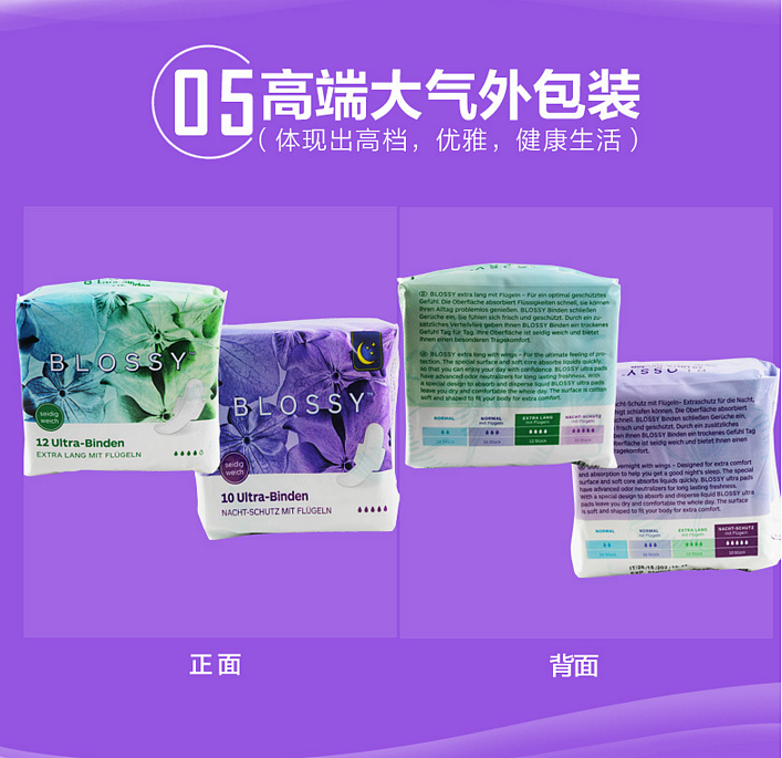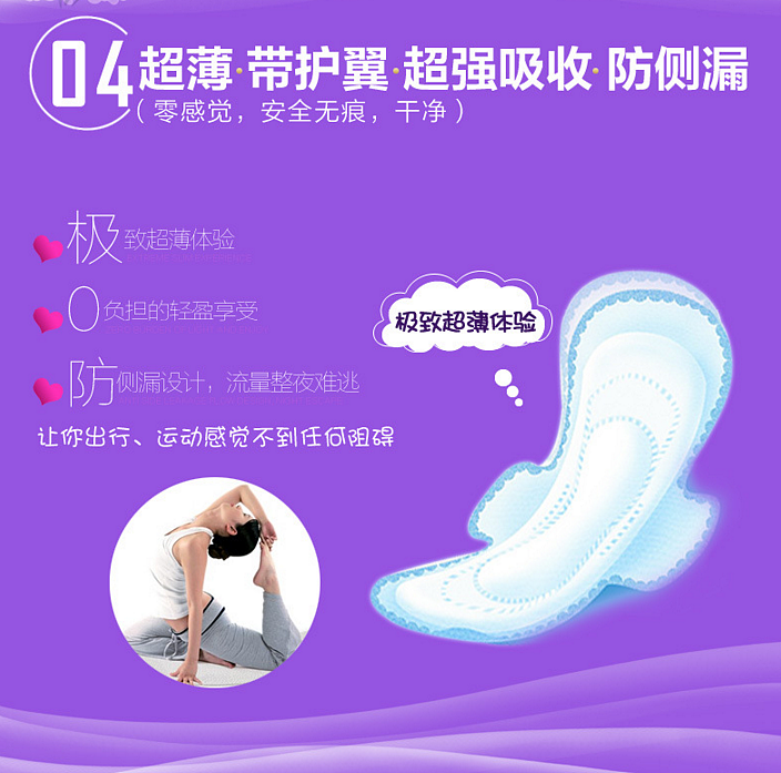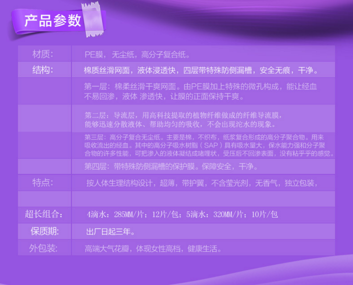 特点:按人体生理结构设计,超薄,带护翼,不含莹光剂,无香气, 独立包装,安全,舒适,便于外出携带。