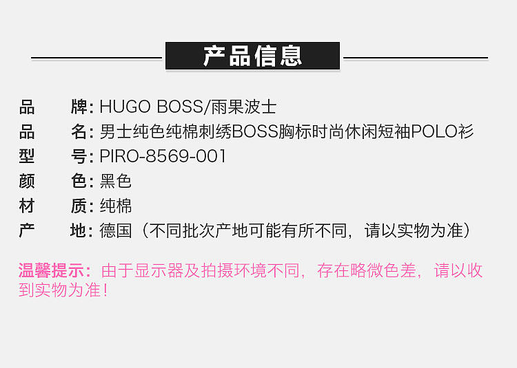 【男款】 HugoBoss雨果博斯男士纯色纯棉刺绣BOSS胸标时尚休闲短袖POLO衫PIRO-50388956-001