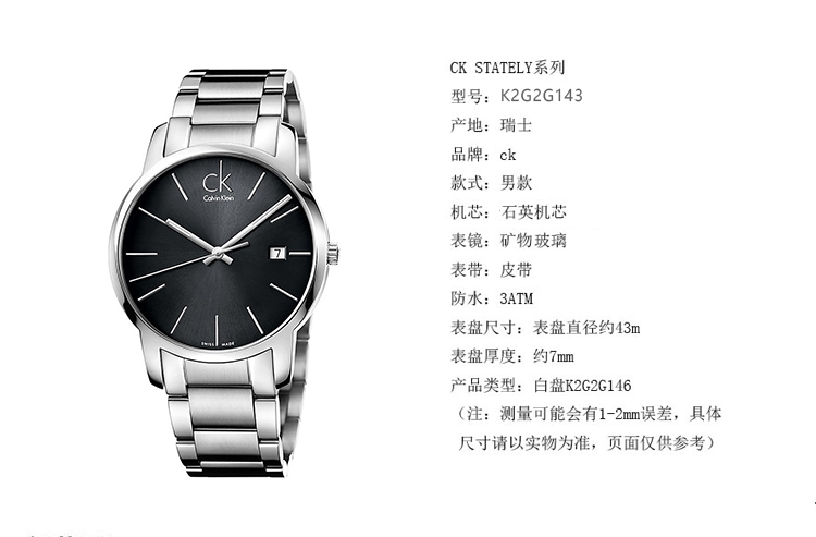卡文克莱 CK手表 男士商务时尚石英表 K2G2G143