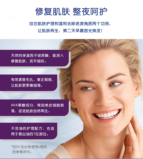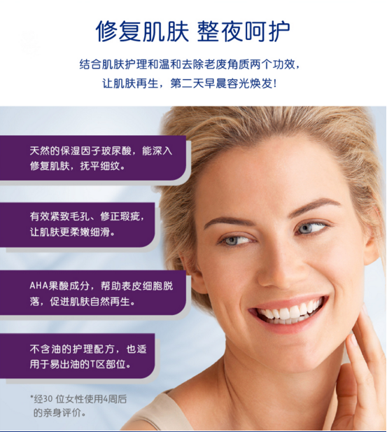天然的保湿因子玻尿酸,能深入修复肌肤,抚平细纹;有效紧致毛孔、修正瑕疵,让肌肤更柔嫩细滑;AHA果酸成分,帮助表皮细胞脱落,促进肌肤自然再生;不含油的护理配方,也适用于易出油的T区部位。