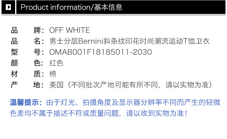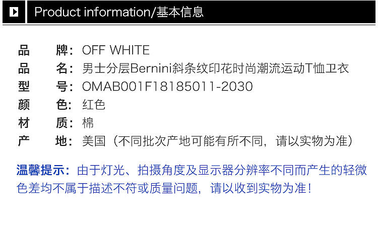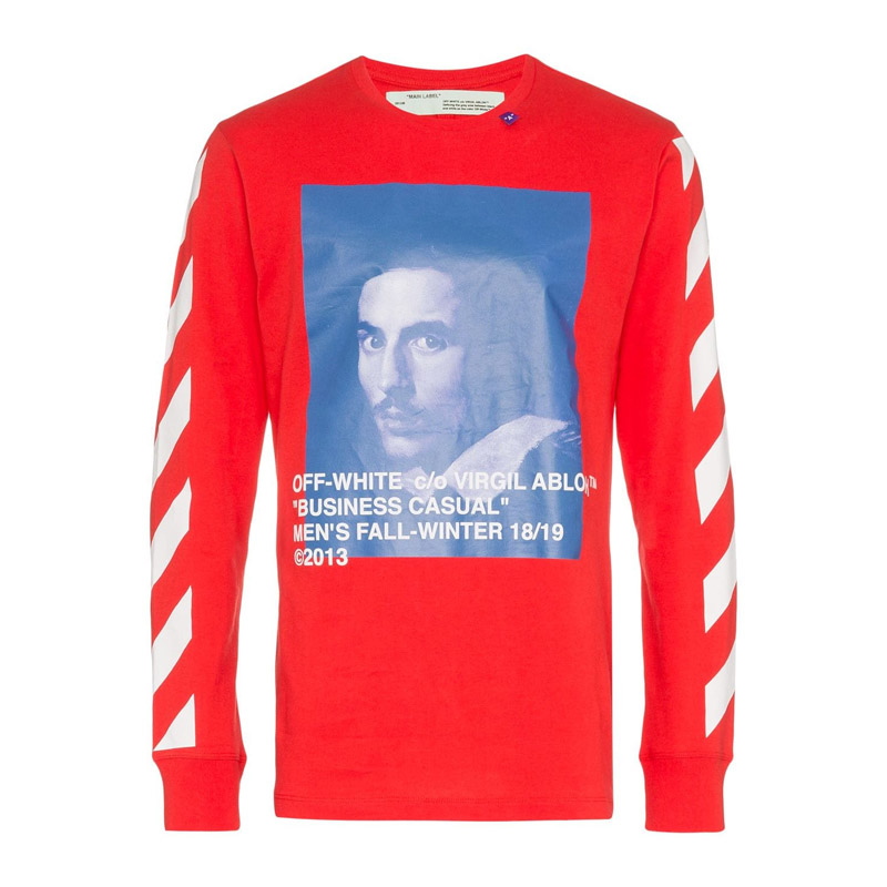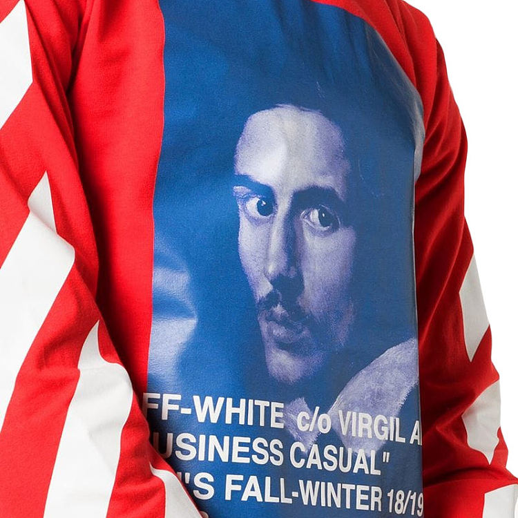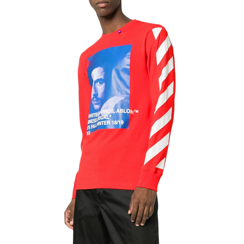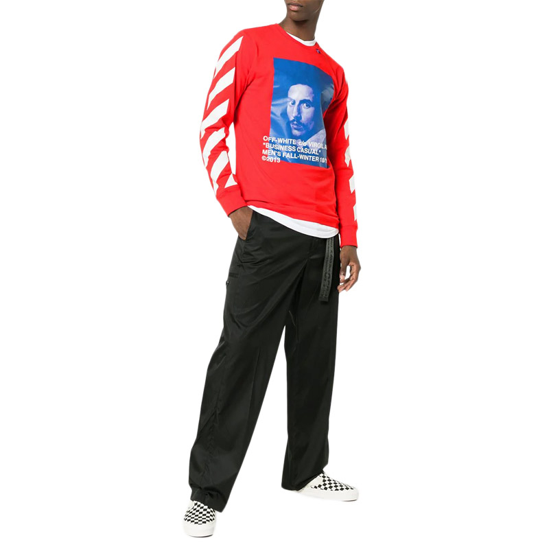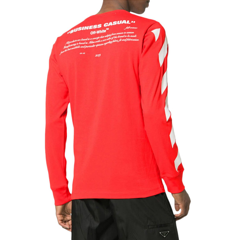 OFF WHITE 男士红色拼蓝色纯棉Bernini斜条纹印花长袖T恤 OMAB001F18185011-2030