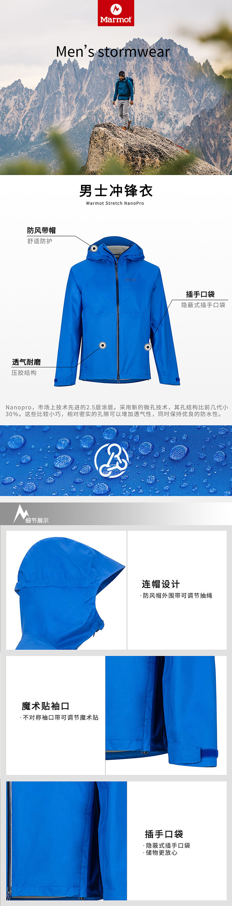 286.3克-Marmot Stretch NanoPro防水透气面料/100%压胶2.5层结构/防风帽外围带可调节抽绳/内置拉链口袋/隐蔽式插手口袋/不对称袖口带可调节魔术贴