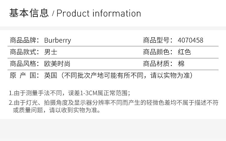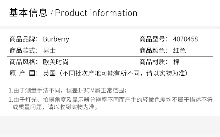 【男款】 Burberry 巴宝莉 男士红色棉质T恤 4070458