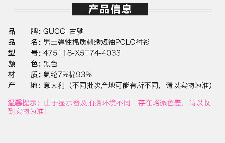 【男款】 GUCCI 古驰 男士刺绣POLO衬衫 475118-X5T74-4033