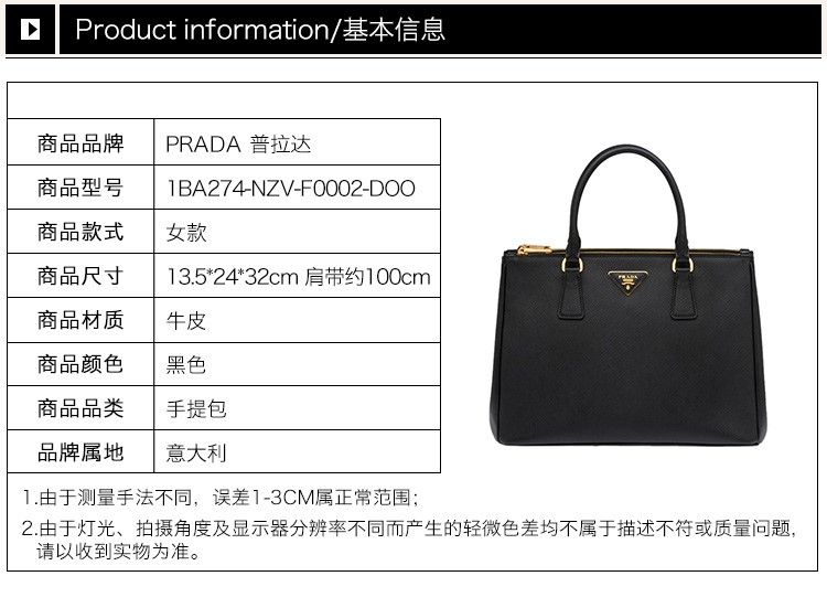 【女款】 Prada 普拉达 女士黑色皮革手提包 1BA274-NZV-F0002-DOO