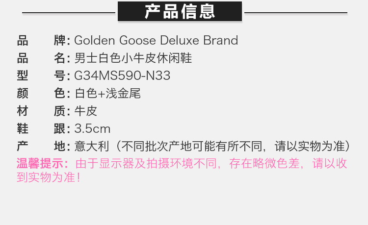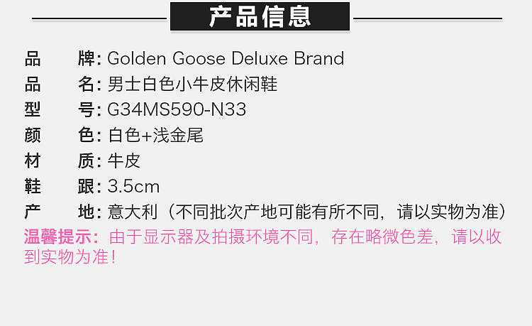 QH GOLDEN GOOSE DELUXE BRAND 男士白色运动鞋 G34MS590-N33