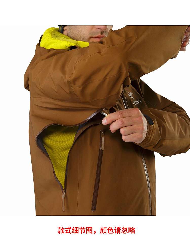 夹克带有口袋,标准款式带腋下拉链,改良的长度可与其他衣物搭配穿着,兜帽带内侧衣领,夹克在暴风雨、攀岩、滑雪或其他户外活动中穿着舒适。