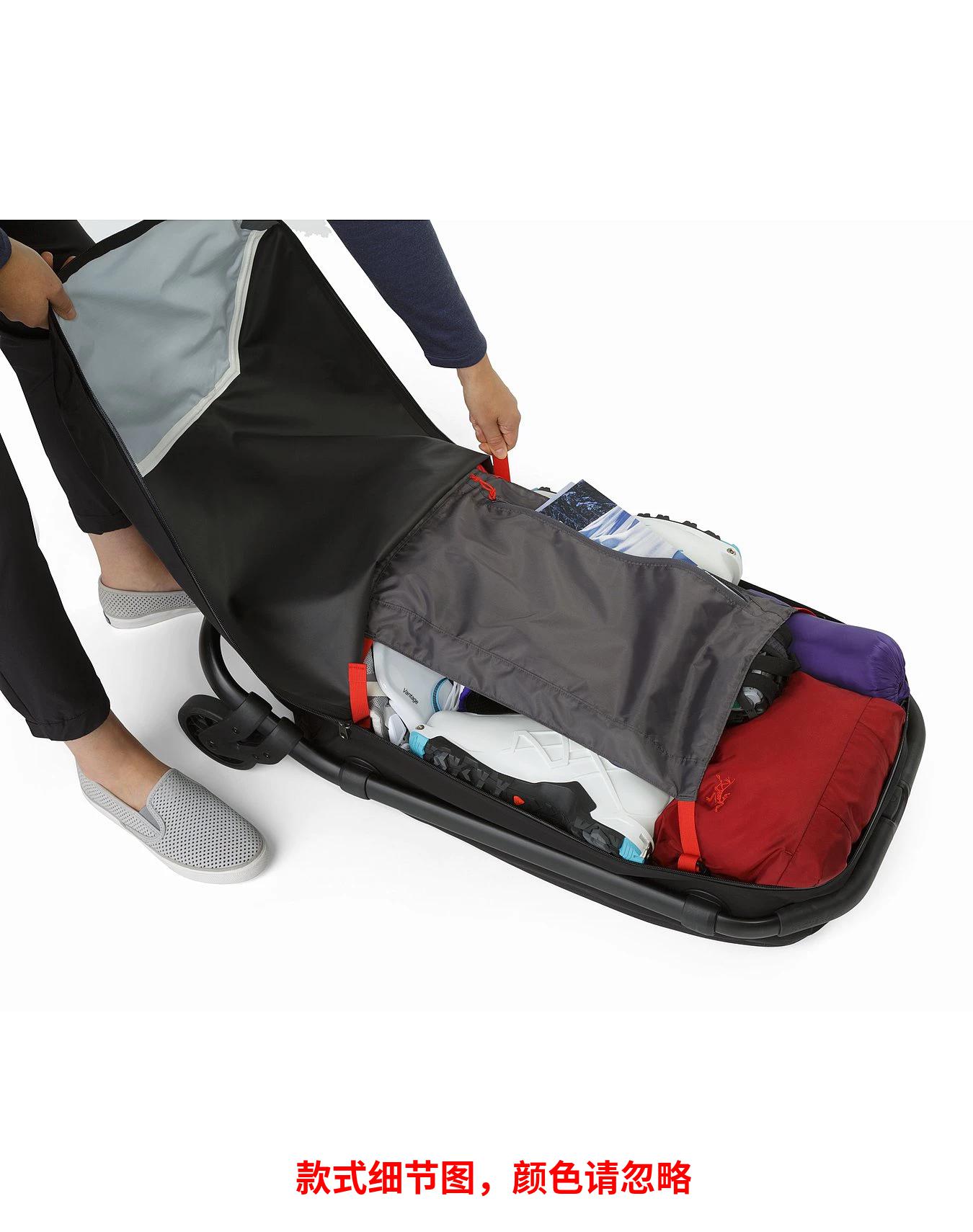 80L滚轮行李箱可存放攀岩、滑雪和徒步旅程的装备。