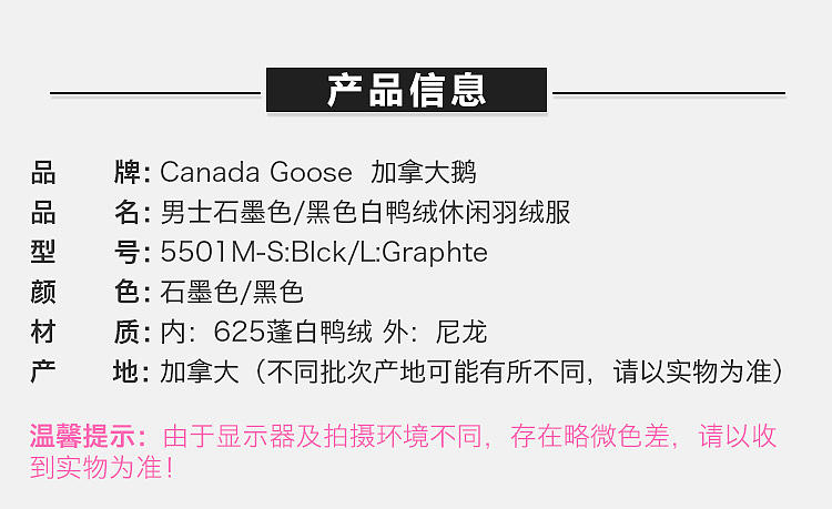 【男款】 Canada Goose 加拿大鹅 男士拼色短款连帽羽绒服 5501M-Black-Graphite