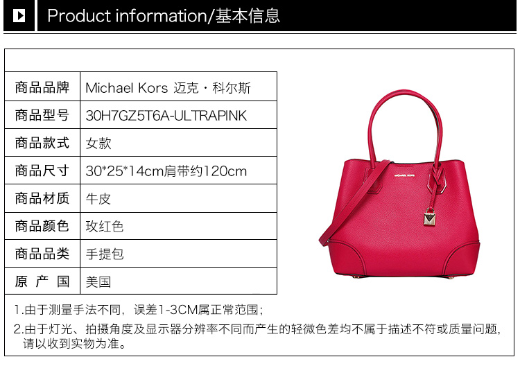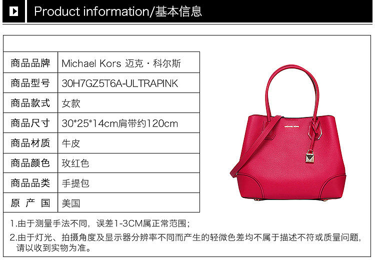 【女款】 Michael Kors 迈克·科尔斯 女士玫红色牛皮大号手提包 30H7GZ5T6A-ULTRAPINK