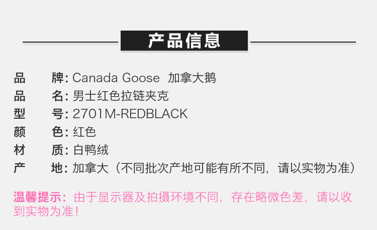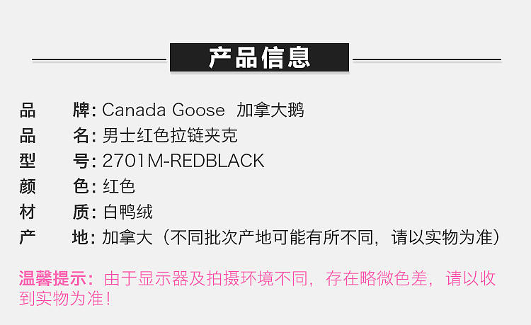 【男款】 Canada Goose 加拿大鹅 男士红色白鸭绒短款羽绒服 2701M-REDBLACK