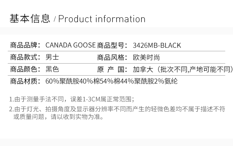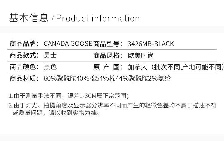 【男款】 Canada Goose 加拿大鹅 黑色经典羽绒服 3426MB-BLACK