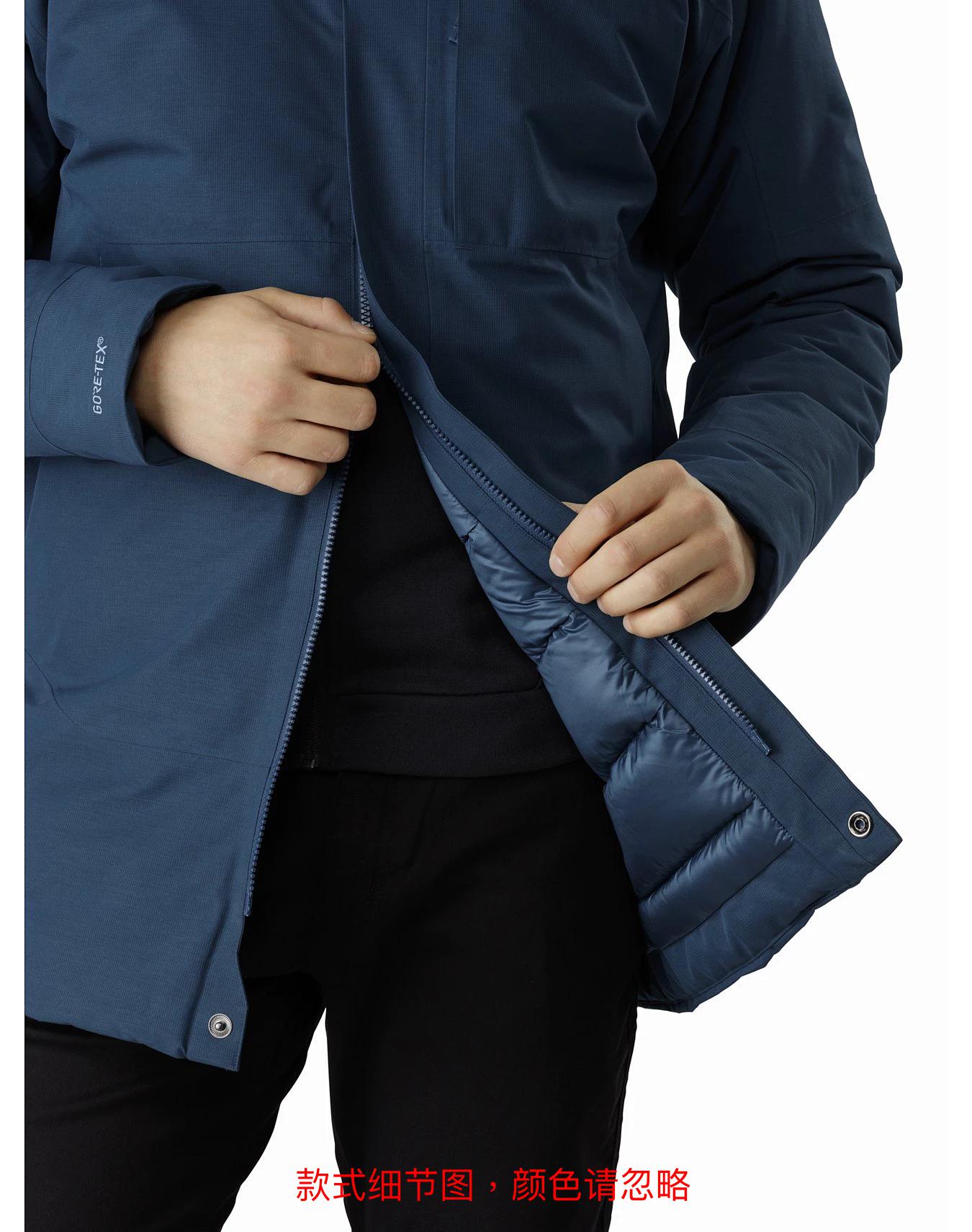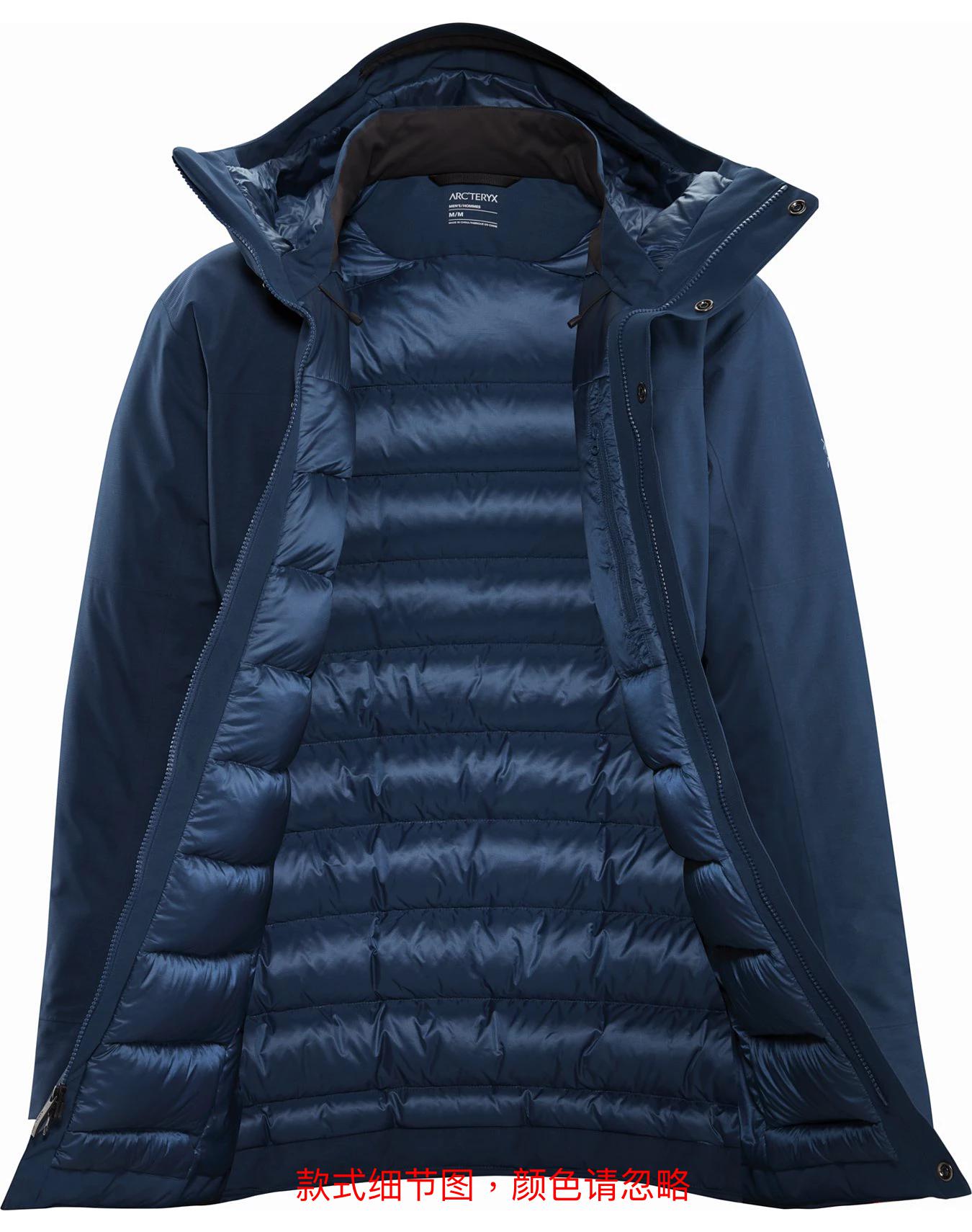大衣外层为防风雨GORE-TEX面料,内层为优质羽绒和Coreloft™合成保暖材料。