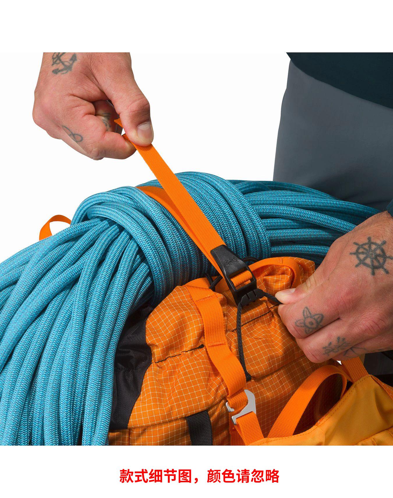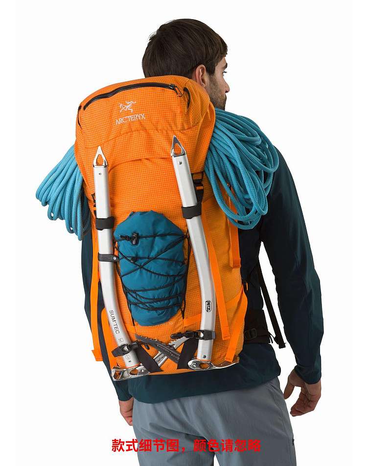 定制织带菊绳可牢固地绑住装备,并可以不同角度携带冰镐这款多用途且耐用的单日背包适合多段攀岩、登山和攀冰使用。