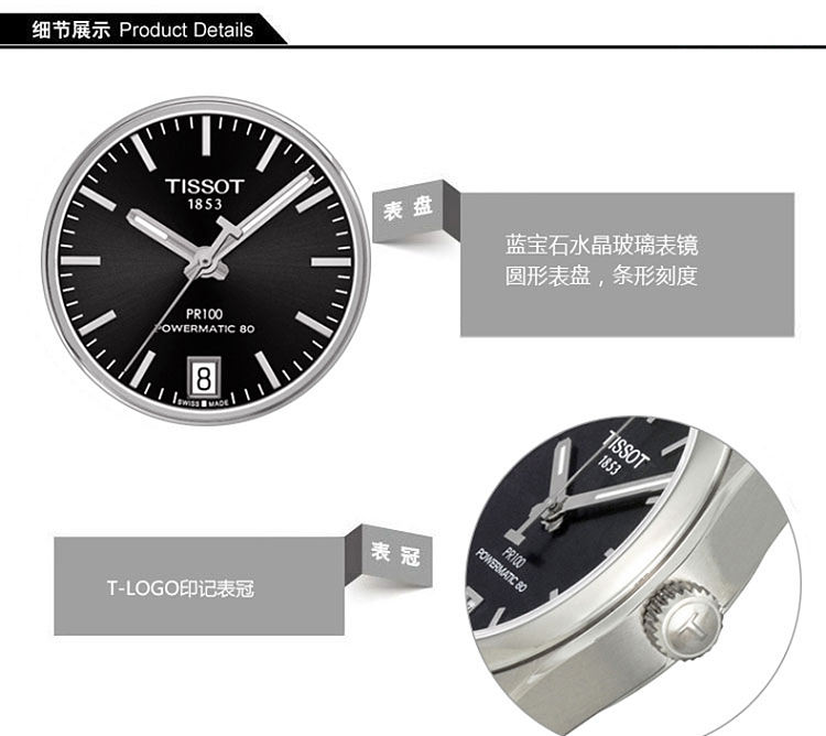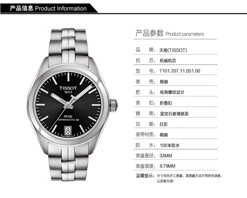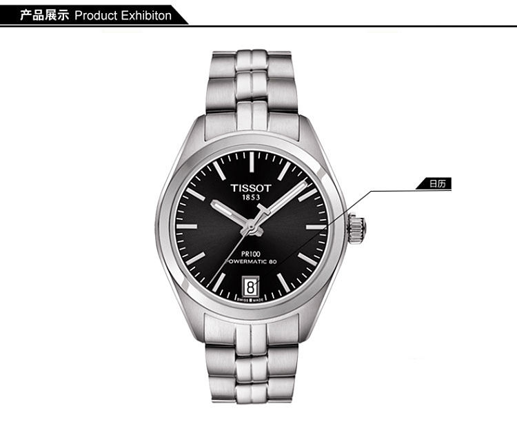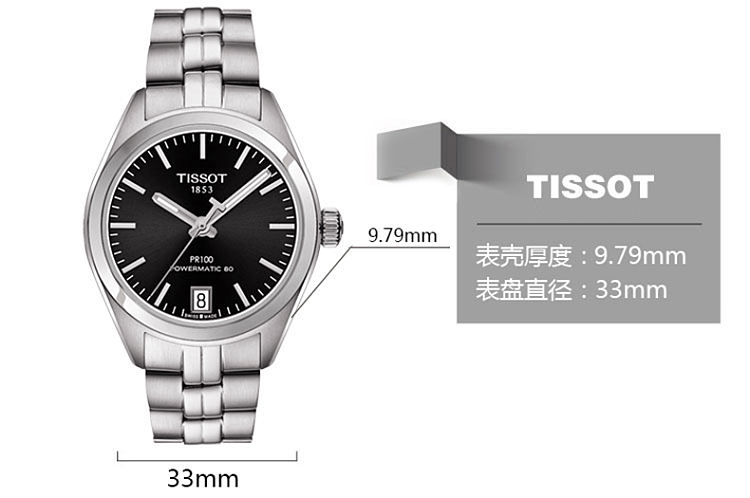 【女款】 TISSOT天梭 PR100系列时尚自动80机芯机械手表黑盘钢带女表 T101.207.11.051.00