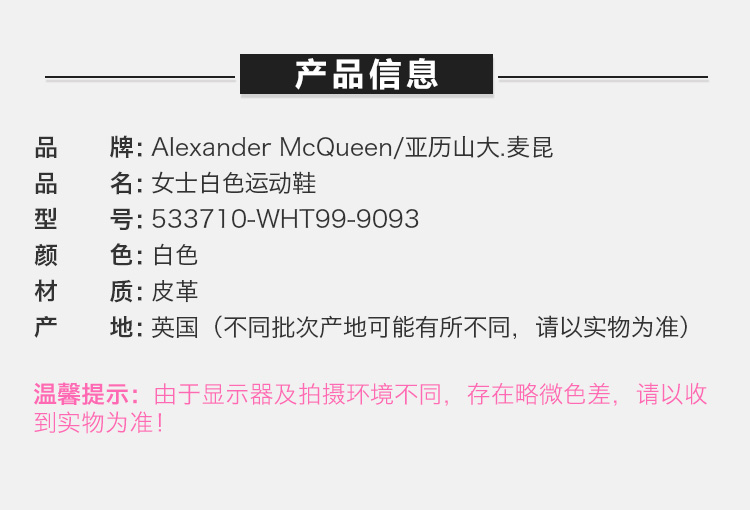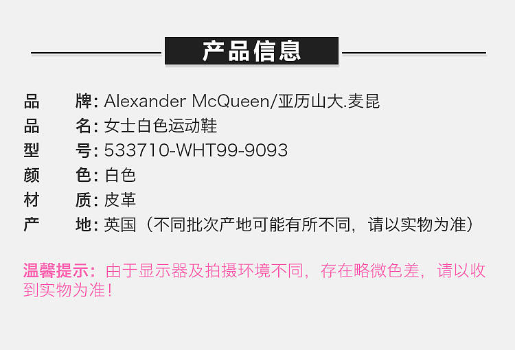 Alexander McQueen 亚历山大·麦昆 女士白色运动鞋 533710-WHT99-9093