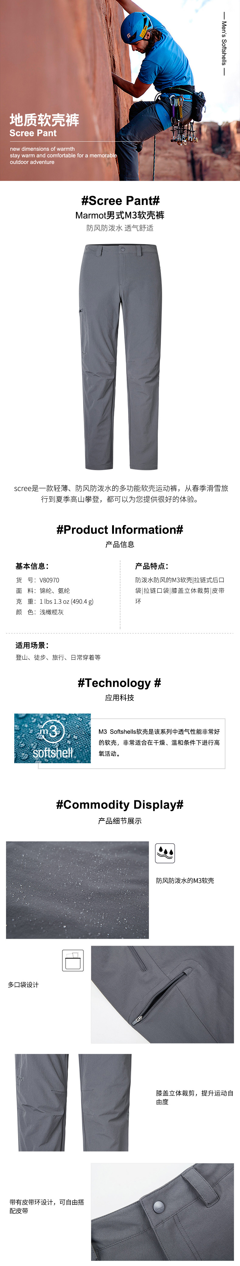 Marmot M3软壳/防拨水,透气/后兜有拉链/大号置物口袋有拉链/裤腰上有啪钮和拉链/右腿袋有拉链