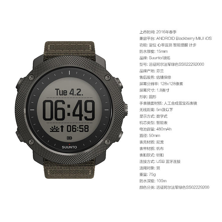 【男款】颂拓(SUUNTO)手表 TRAVERSE远征系列GPS多功能户外运动松拓远征阿尔法军绿色军表SS022292000