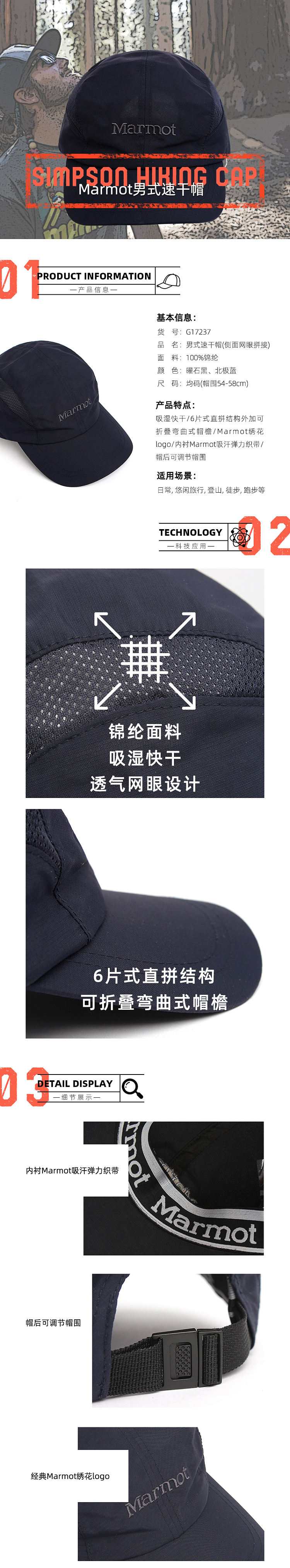 【男女通款】MARMOT 中性 帽子 速干网眼棒球帽 运动户外休闲帽 17237 曜石黑