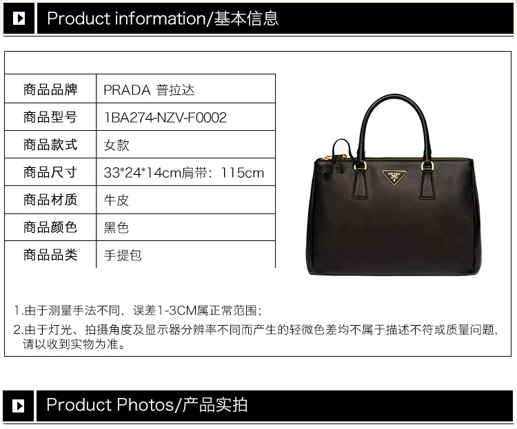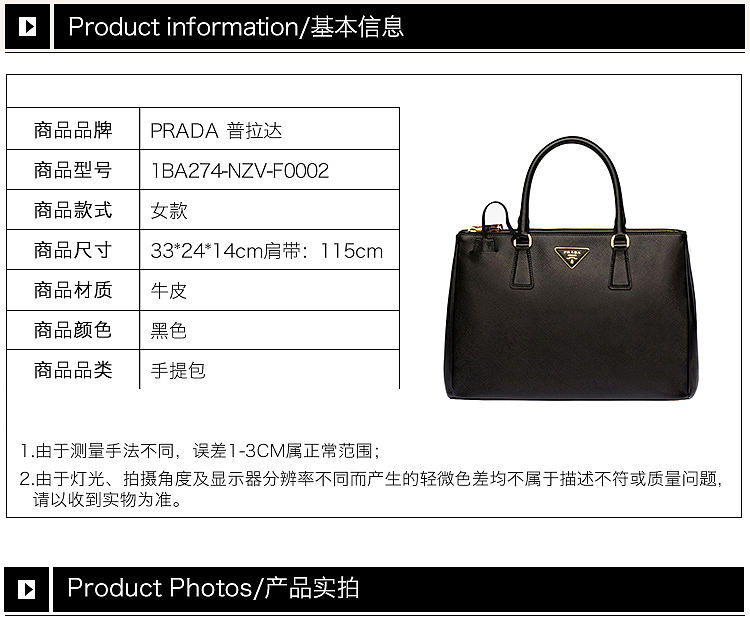 【女款】 Prada 普拉达 黑色牛皮女士手提包 1BA274-NZV-F0002