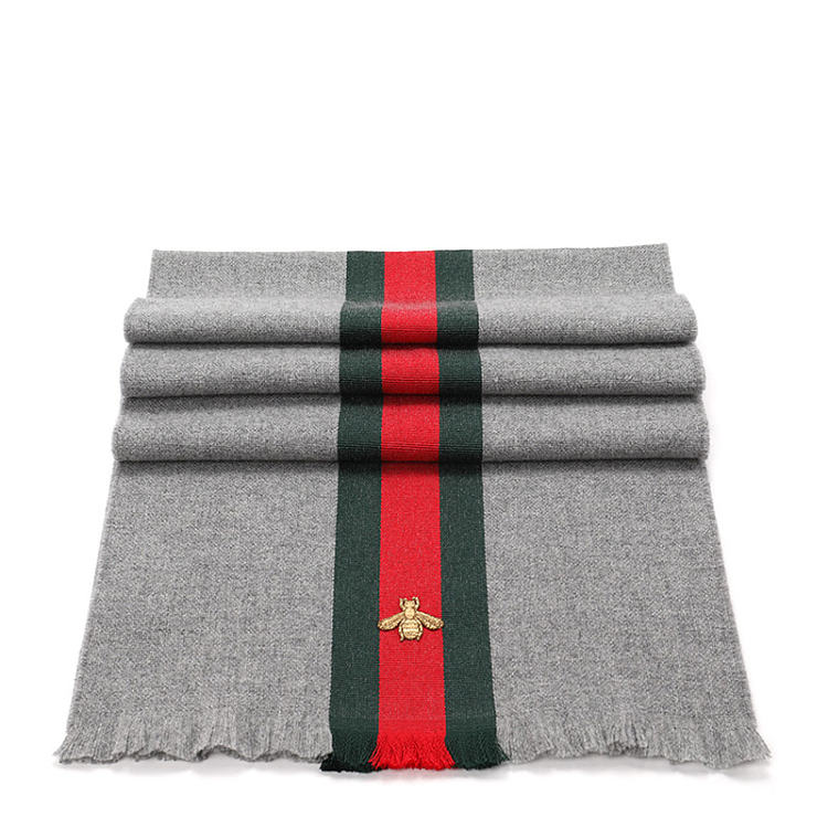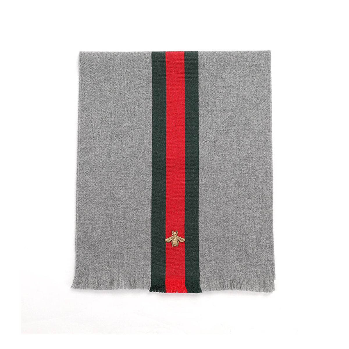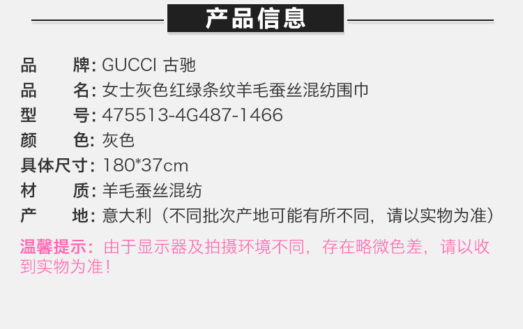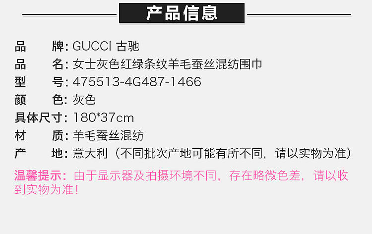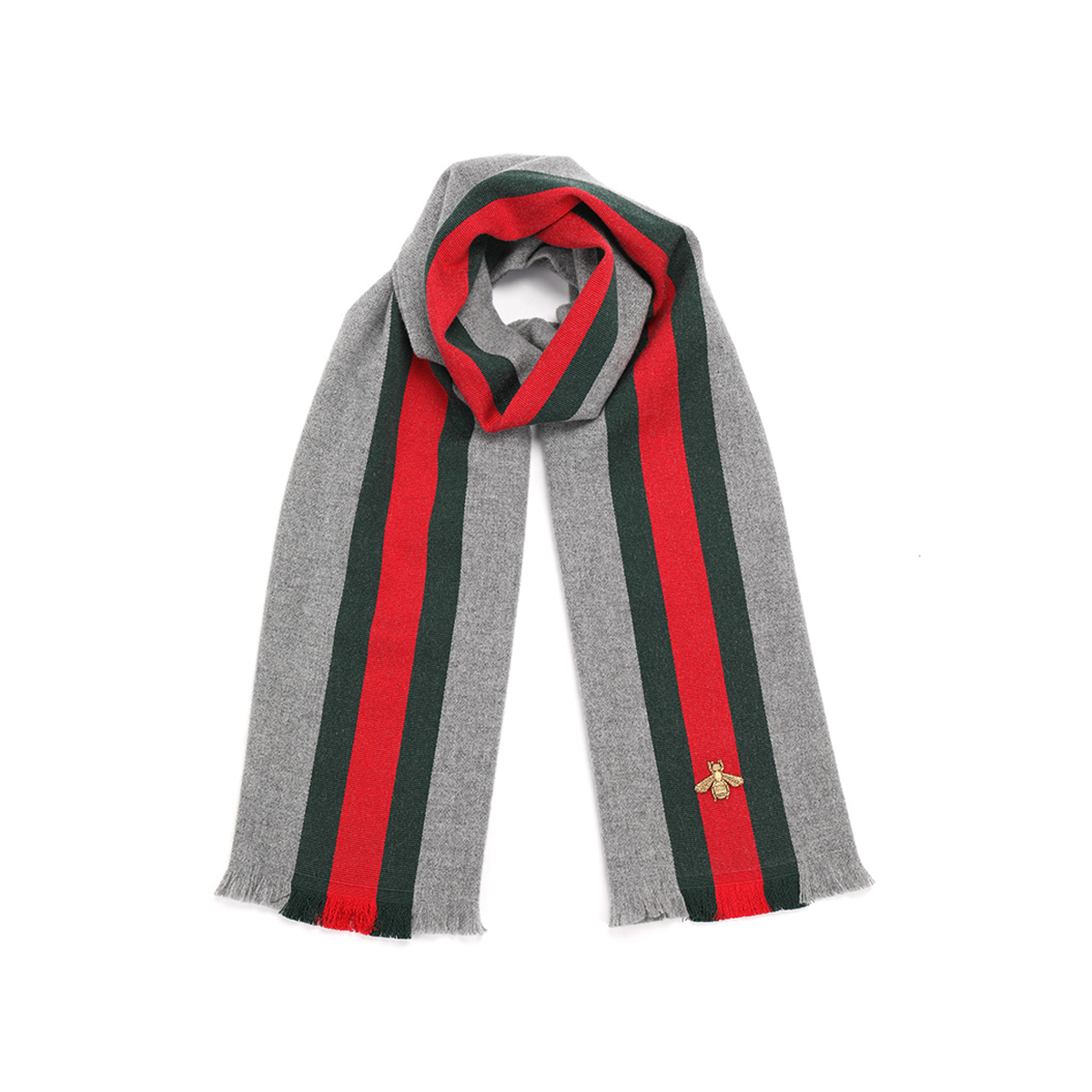 【男款】 GUCCI 古驰 男士灰色红绿条纹羊毛蚕丝混纺围巾 475513-4G487-1466