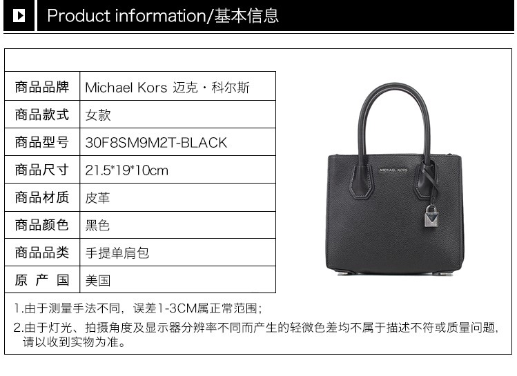 【女款】 QHMichaelKors迈克·科尔斯女士黑色手提包30F8SM9M2T-BLACK