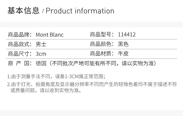 【男款】 Mont Blanc 万宝龙 男士黑色牛皮腰带 114412