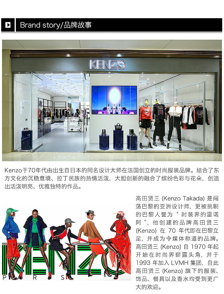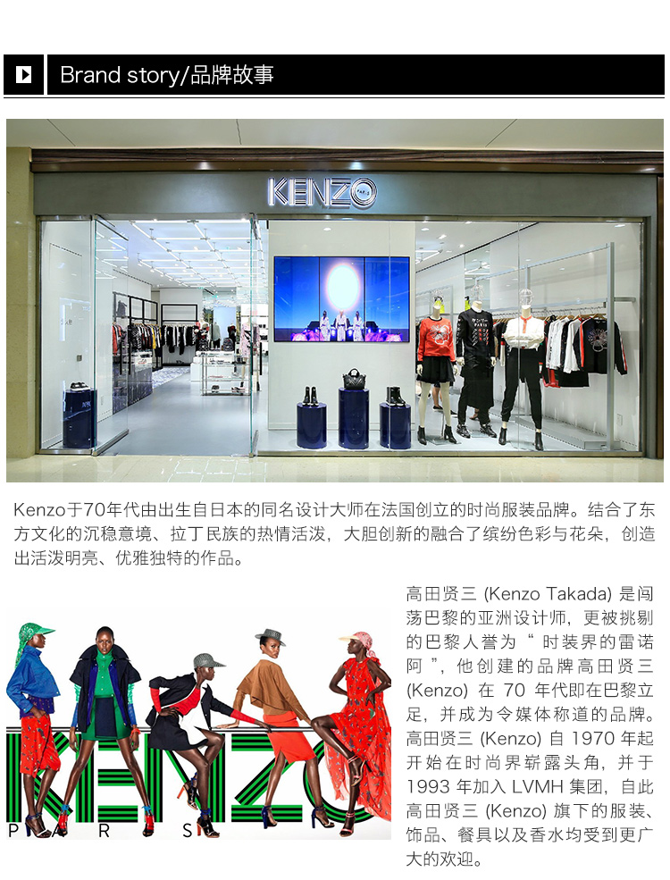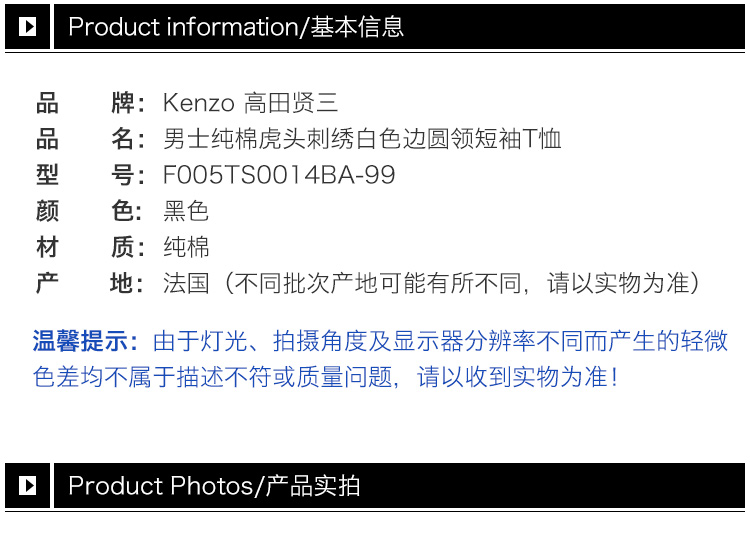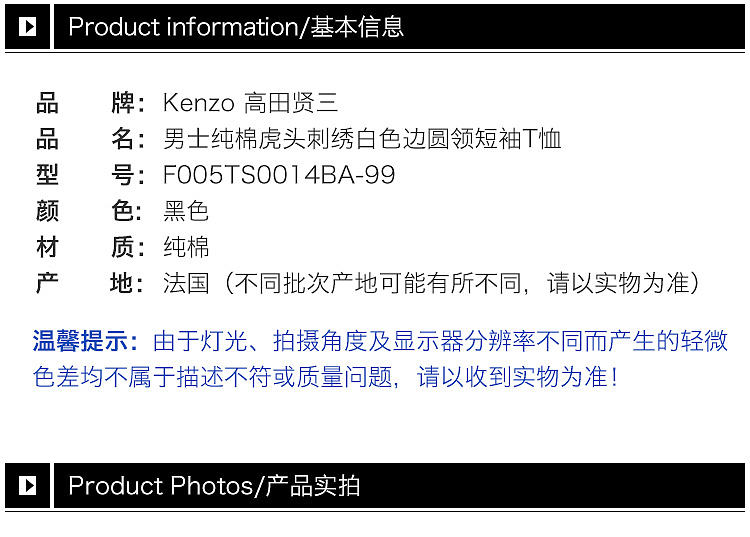 【男款】 QH Kenzo 高田贤三 男士黑色棉质T恤 F005TS0014BA-99