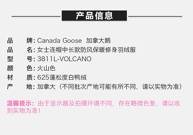 【女款】 Canada Goose 加拿大鹅 女士火山色鸭绒羽绒服 3811L-VOLCANO