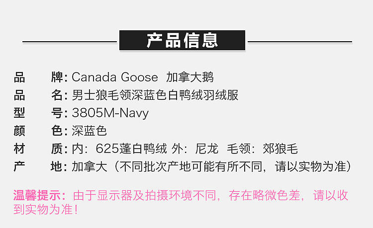 【男款】 CanadaGoose加拿大鹅男士连帽拉链羽绒服3805M-Navy