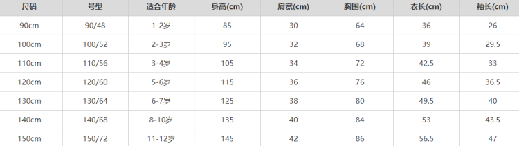 尺码 90cm 100cm 110cm 120cm 130cm 140cm 150cm