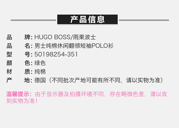 【男款】 HugoBoss雨果博斯男士翻领短袖POLO衫50198254-351