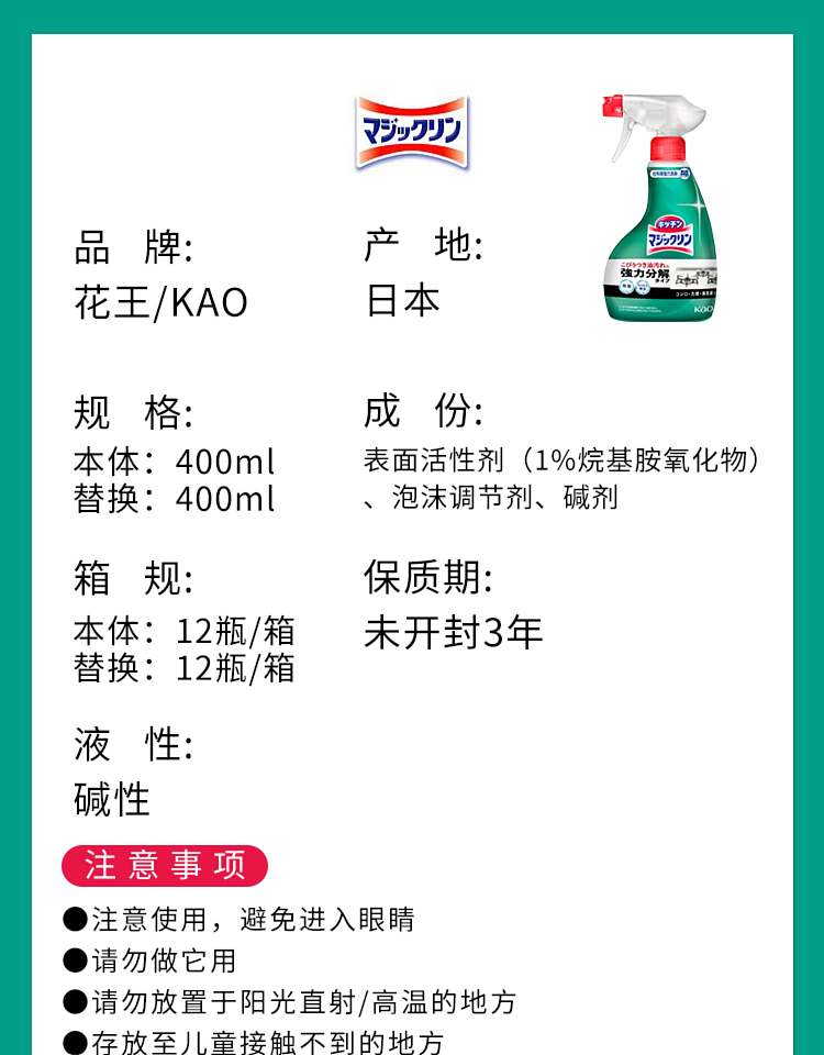 花王厨房油污泡沫清洁喷雾400ml 薄荷型