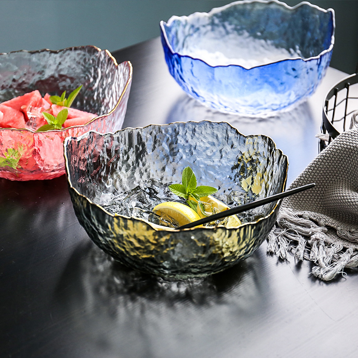 日式金色边透明玻璃碗家用大号水果沙拉碗北欧创意水果沙拉盘中号20cm