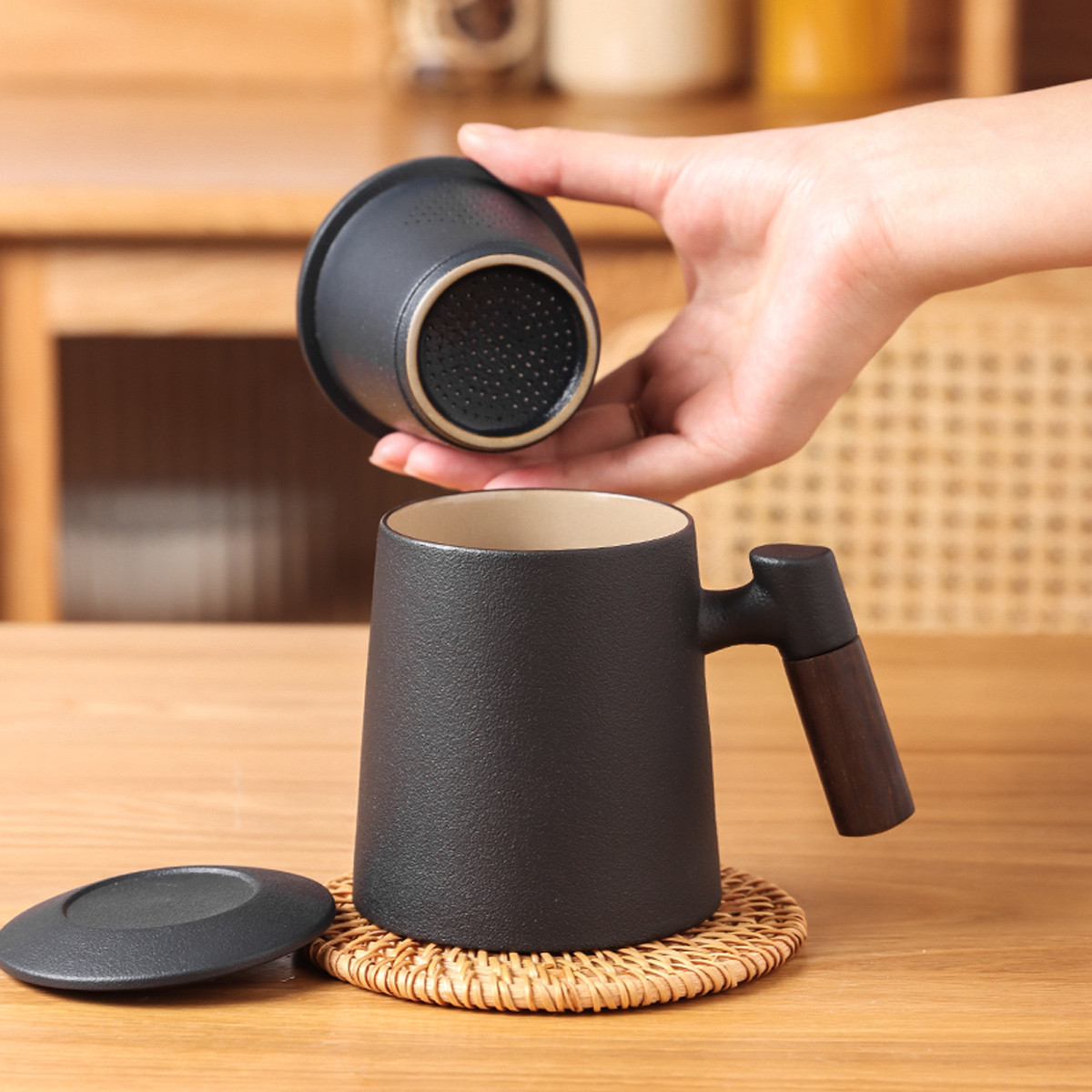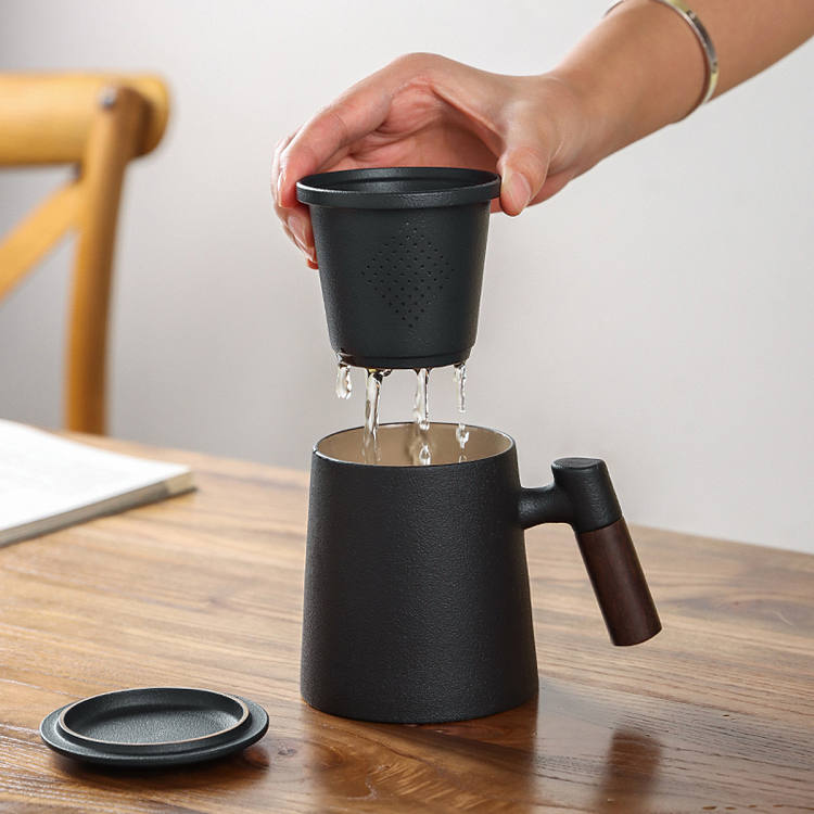 陶瓷茶杯茶水分离泡茶杯个人专用办公室水杯男喝茶杯子茶具带盖过滤泡茶杯+藤编隔热垫