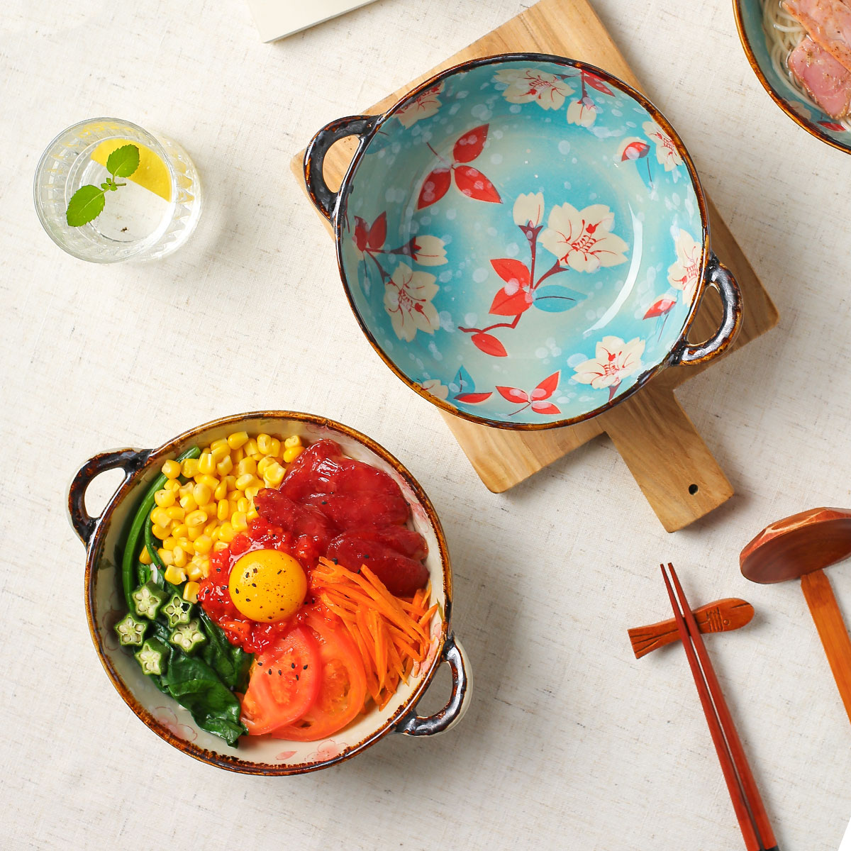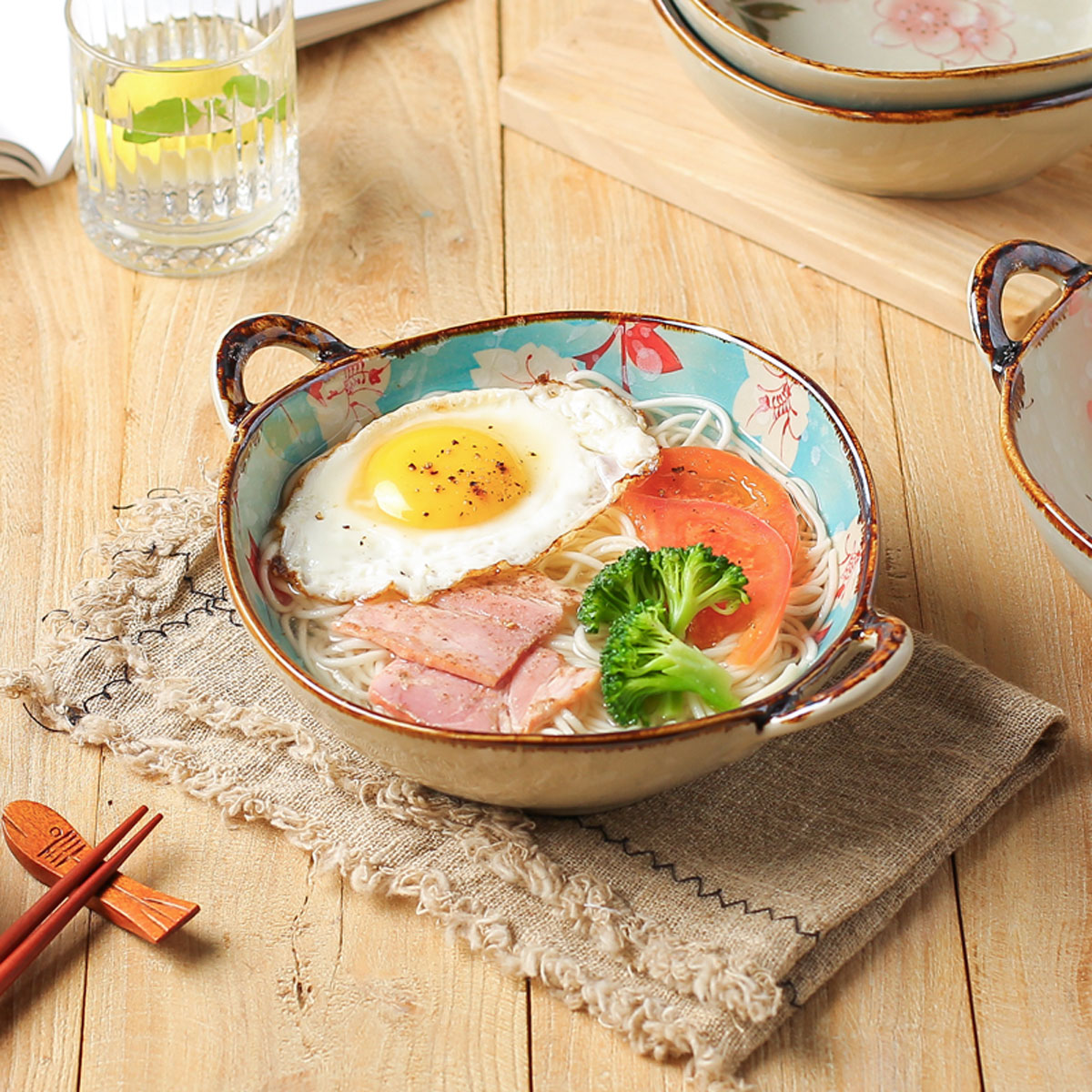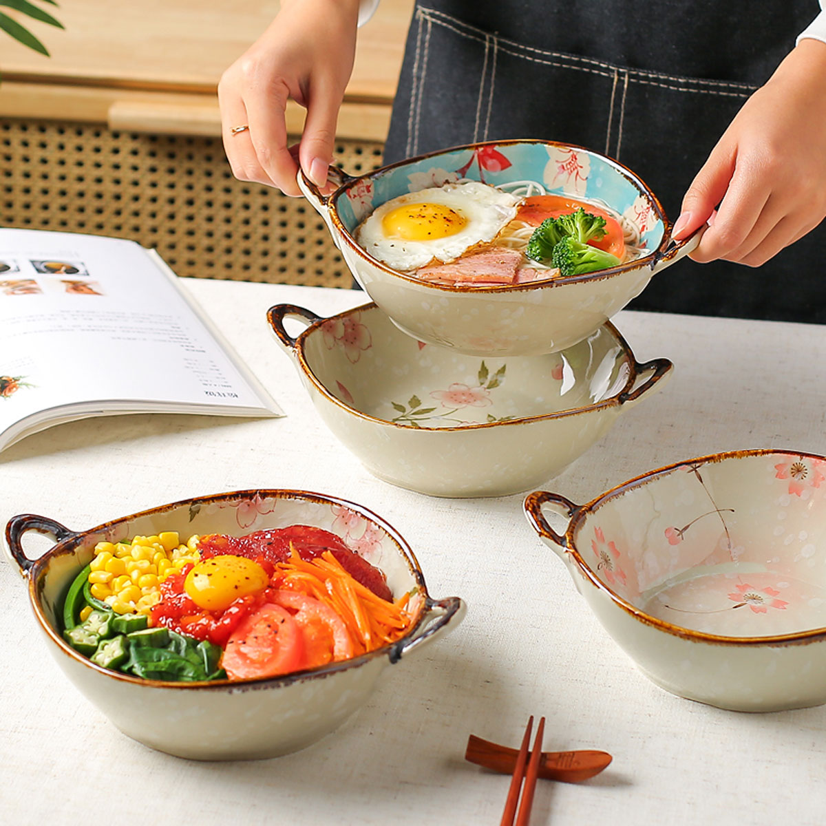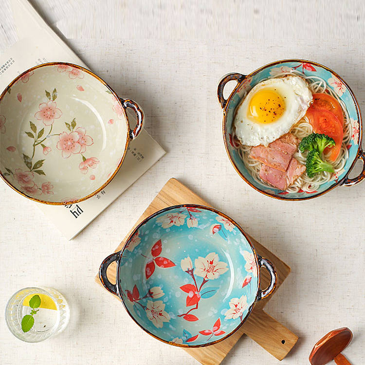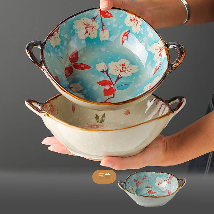 【釉下彩】日式双耳汤碗家用陶瓷大碗拉面碗创意餐具手柄汤盆