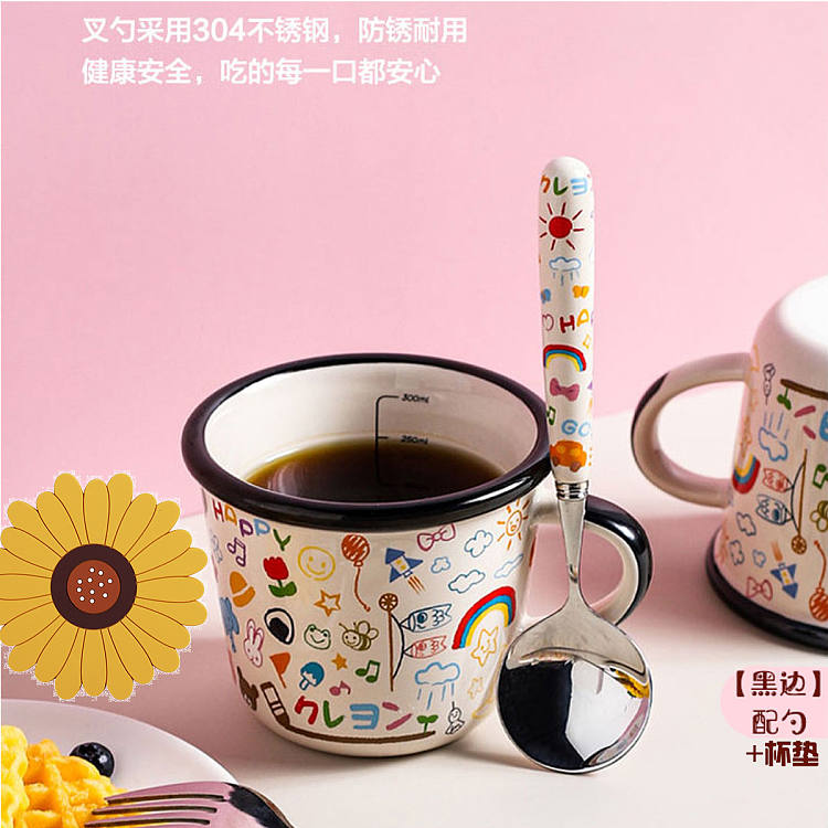 【马克杯+勺+杯垫】 马克杯家用陶瓷带刻度小号喝水杯子女咖啡杯早餐牛奶杯