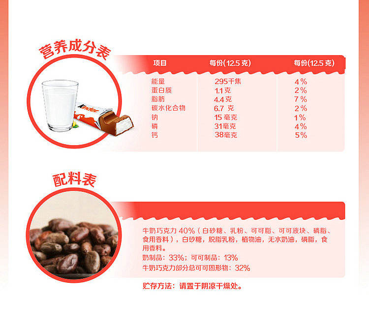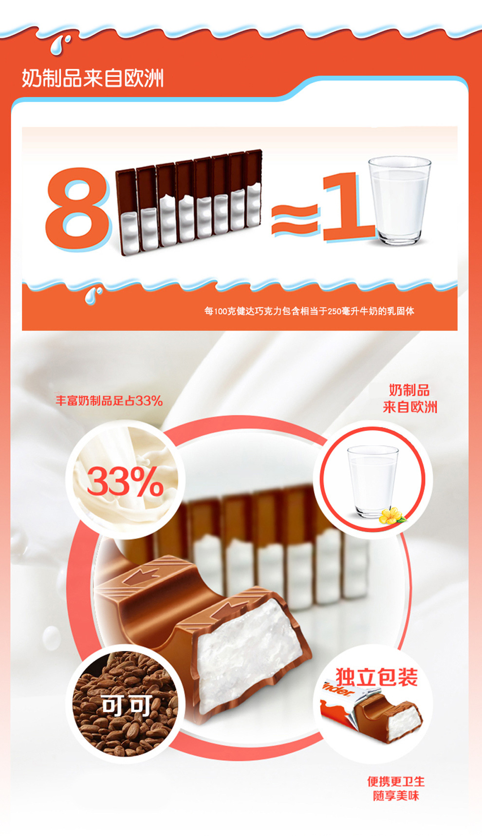 健达kinder牛奶巧克力条夹心巧克力t8条装100g  40084701
