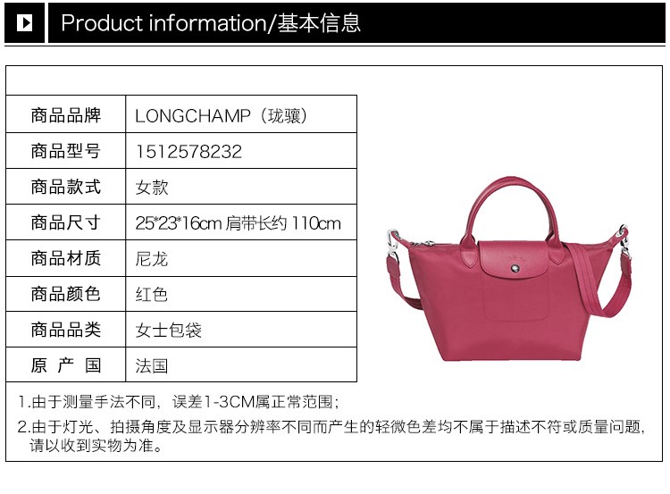 【女款】 Longchamp珑骧玫红色尼龙女士手提包1512578232