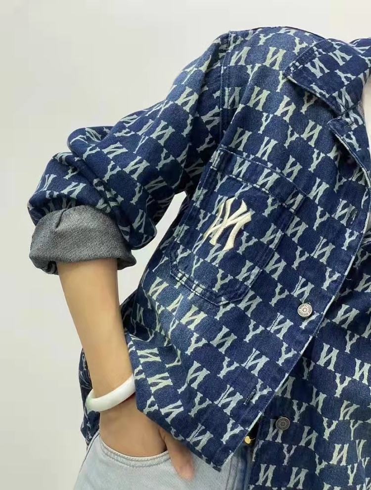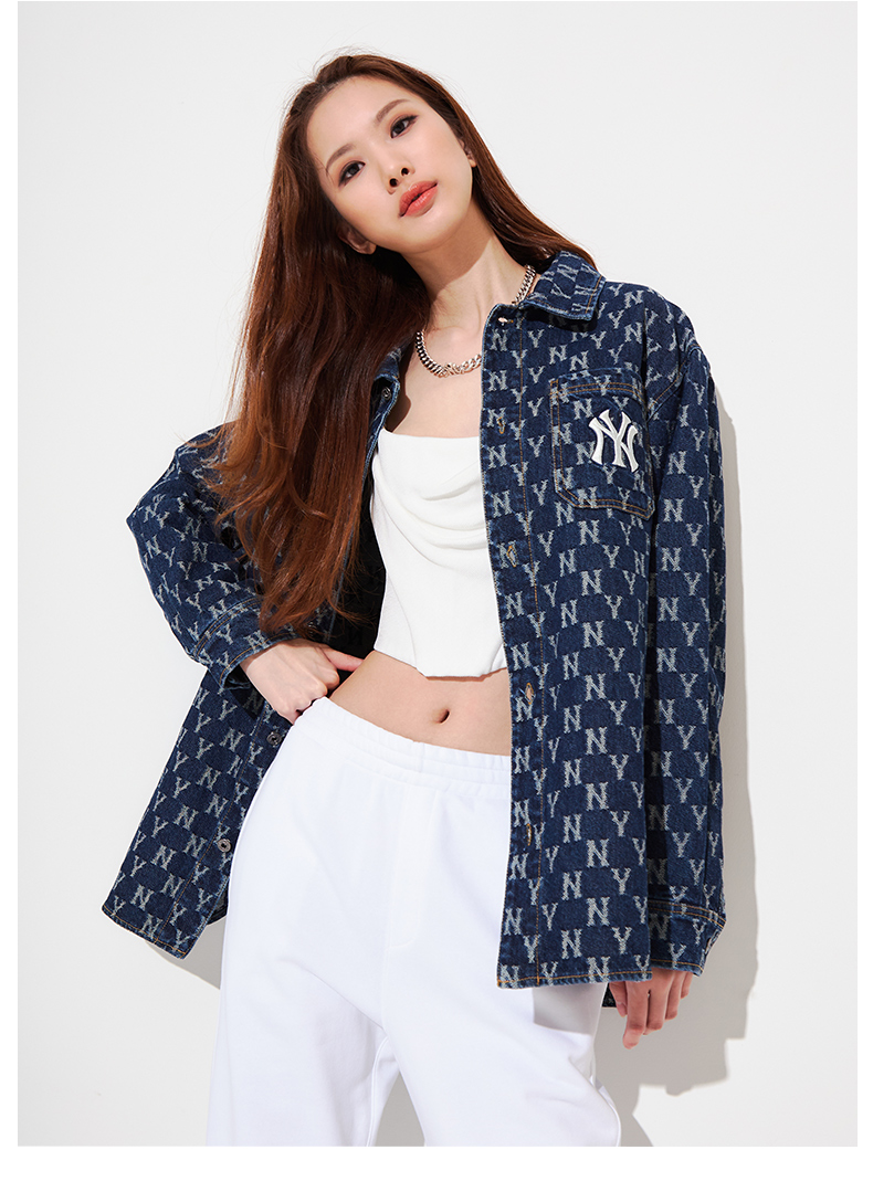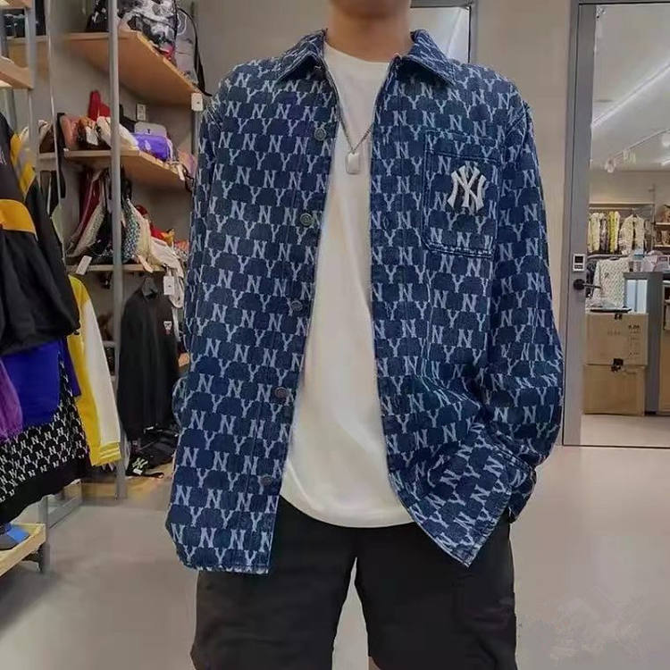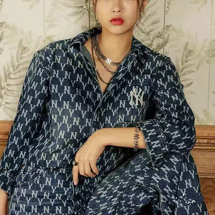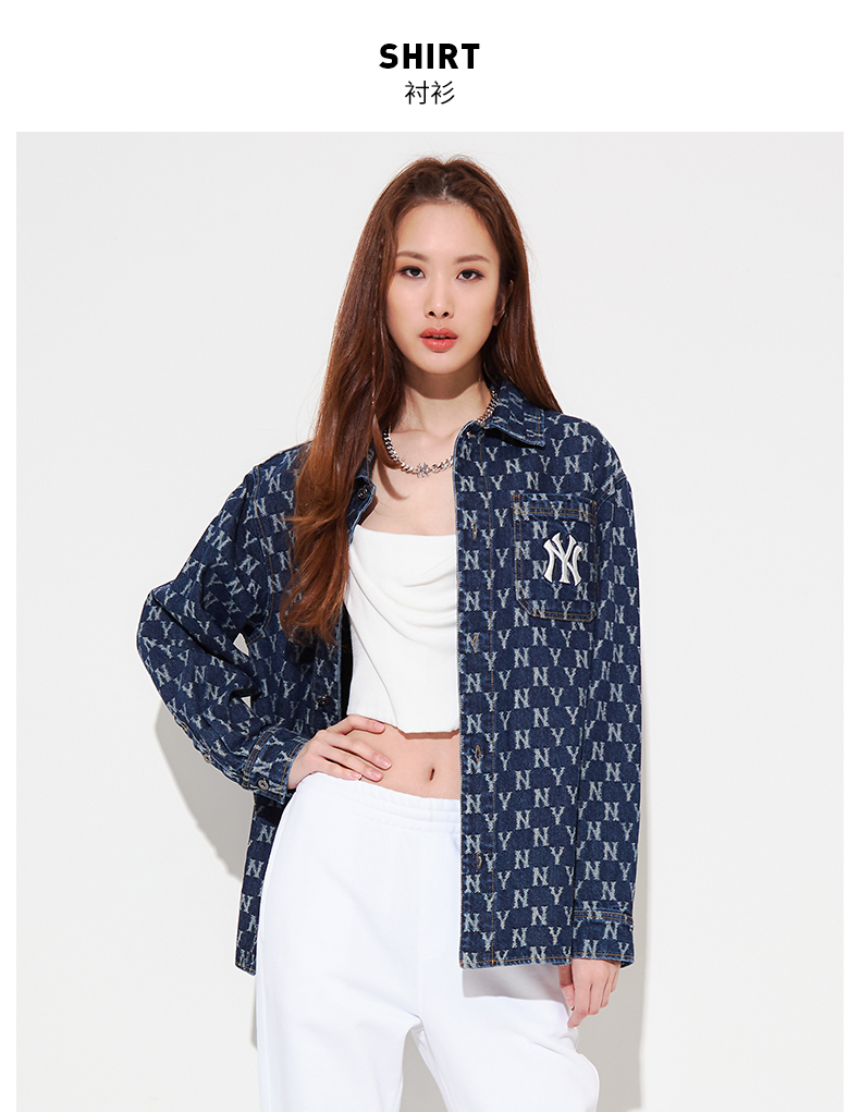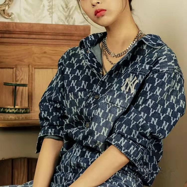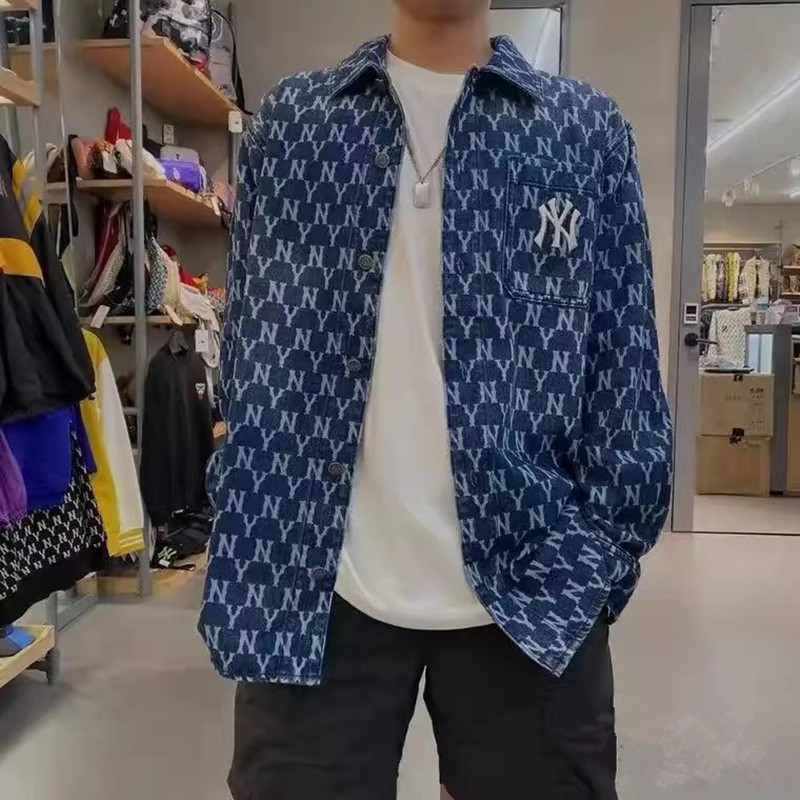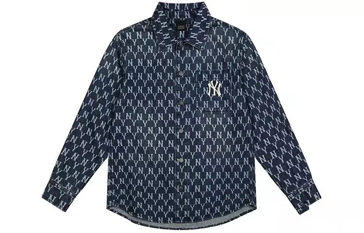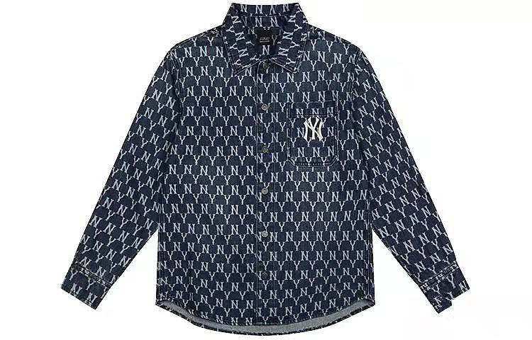 【男女通款】 韩国MLB2022新款 纽约洋基队老花满印牛仔衬衫外套 男女同款 蓝色