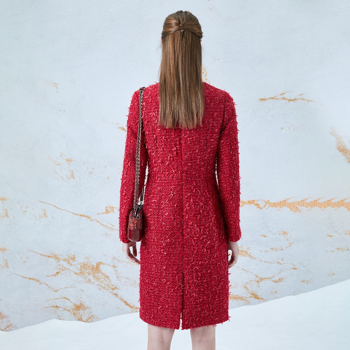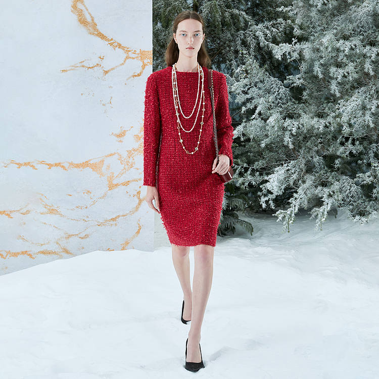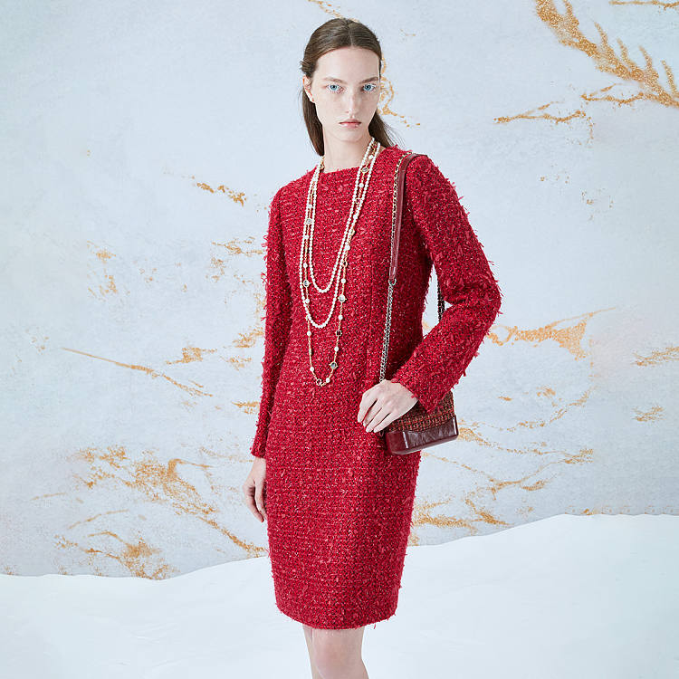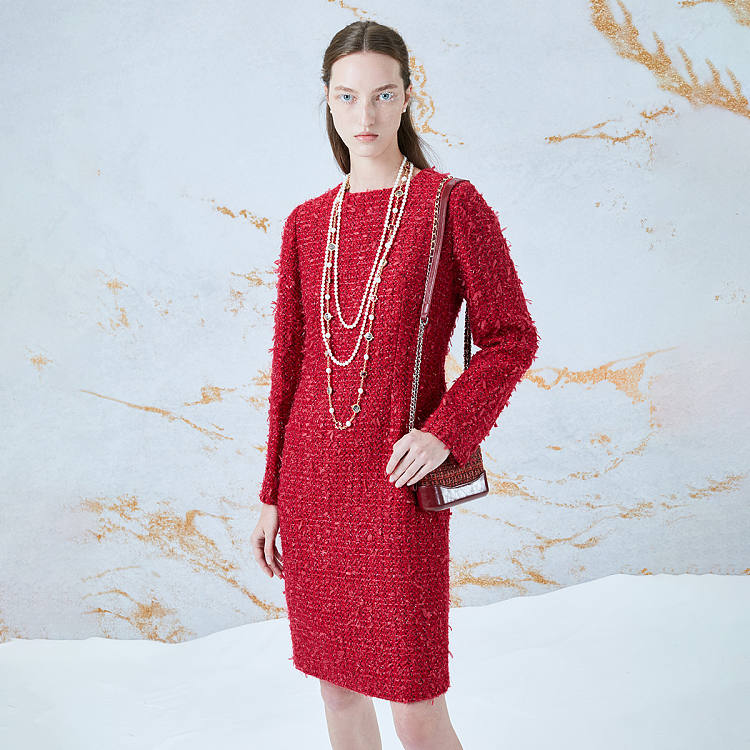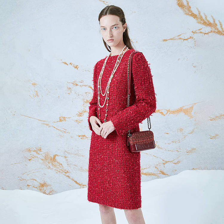 【女款】 新年款粗花呢长袖圆领女士连衣裙