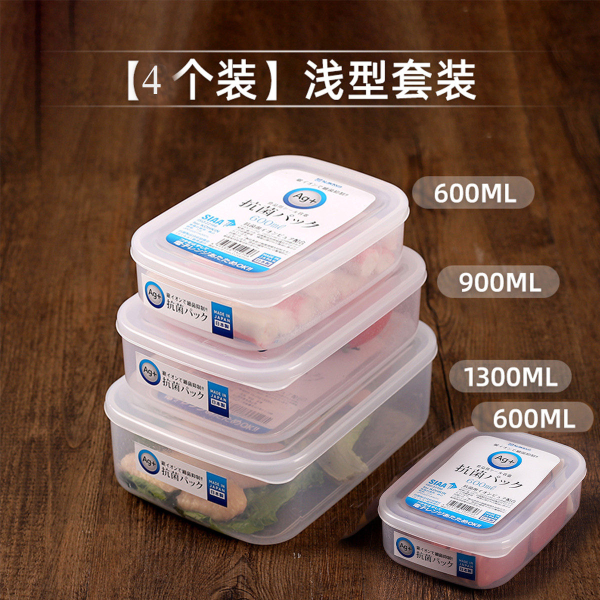 日本进口抗菌冰箱收纳盒密封保鲜盒食品级冷冻专用整理盒600+600+900+1300 (4个装)浅型套装